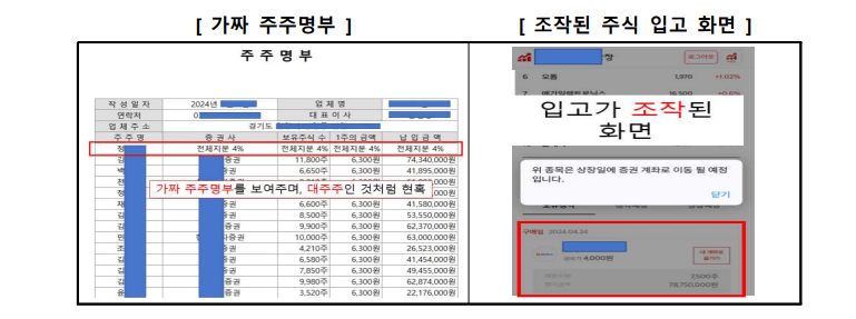 사기꾼들은 투자자들에게 가짜 주주명부 등을 보여주며 대주주 또는 회사 보유 주식 등을 저가에 매각한다며 현혹하거나, IPO 예정주식을 무료로 지급한다며 가짜 비상장주식 거래 플랫폼의 가입을 유도한 후 화면 조작으로 주식이 입고된 것처럼 속이고, 주주대상 "유상 배정권리" 부여로 주식 저가 매입이 가능하다며 현혹합니다.