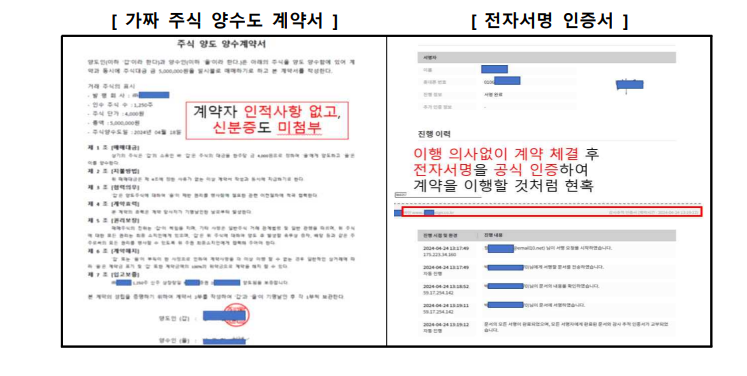 사기꾼들은 비대면으로 주식 양수도 계약서를 작성한 후 온라인 서명 프로그램을 이용하여 계약을 실제 이행할 것처럼 투자자를 속입니다. 그러나 업자는 업체명과 상이한 명의의 통장(대포통장)으로 투자금을 입금 받은 후 상장 당일 주식을 입고하지 않고 잠적합니다.