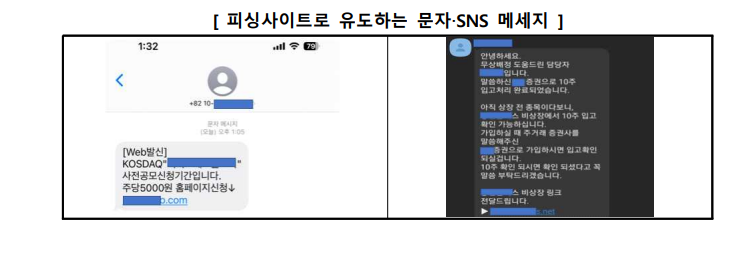주식거래 경험이 거의 없는 피해자 C씨는 2024년 4월경 甲사 주식의 “사전공모 신청기간”이라며 S사 홈페이지 링크가 있는 스팸 문자를 수신하고 링크를 클릭하여 甲사 홈페이지(가짜)에 접속했습니다.