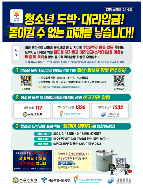서울경찰청은 이번 긴급 스쿨벨 발령과 함께 서울 지역 모든 학교를 대상으로 청소년 도박 및 대리입금에 대한 실태조를 실시합니다. 5월 20일부터 7월 19일까지 2개월간 진행될 이 조사는 초등학교 5, 6학년, 중·고등학생 및 학부모를 대상으로 무기명으로 실시되며, 긴급 스쿨벨에 포함된 QR 코드를 통해 쉽게 참여할 수 있습니다. 또한 학생은 교사의 조례나 종례 시간 및 학교전담경찰관의 범죄예방교육시간을 활용하여 참여하게 됩니다.